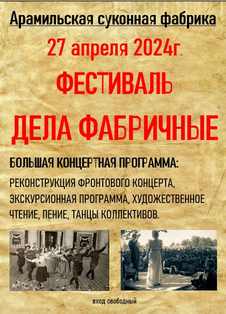 27 апреля 2024 года на Арамильской суконной фабрике пройдет реконструкция фронтового концерта времен Великой Отечественной войны. Данное событие станет ключевой точкой культурно-исторического фестиваля «Дела фабричные».